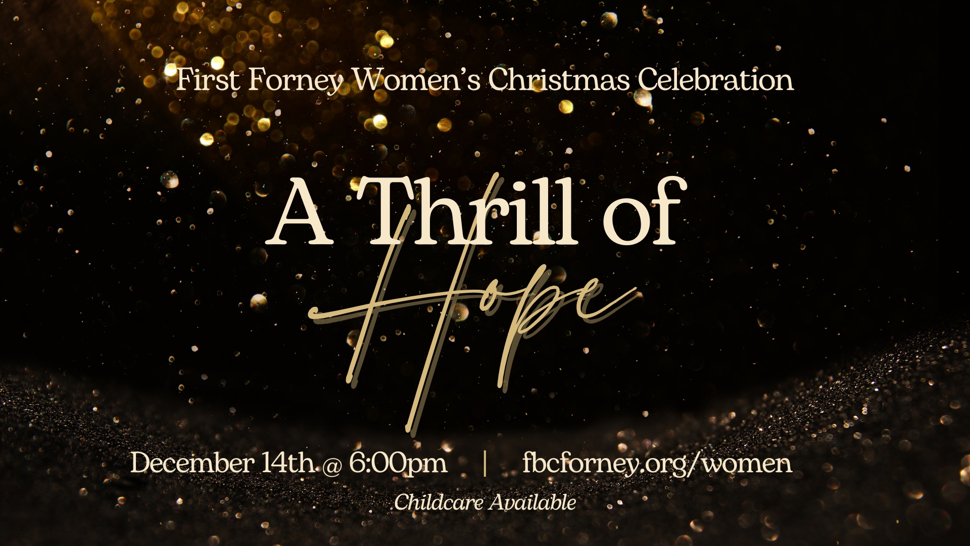 We’re so excited to invite you to A Thrill of Hope, our Women’s Christmas Dinner at First Baptist Forney! Together, we’ll pause in the wonder of the season and celebrate the God who fills us with all joy and peace.